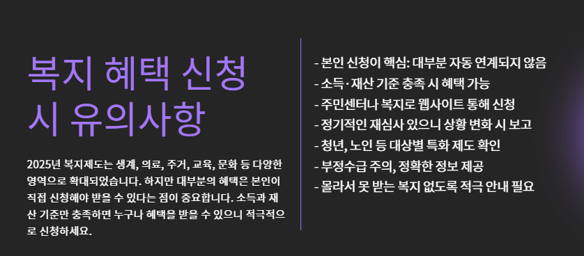 소득·재산 기준만 맞으면 누구나 당당하게 혜택을 받을 수 있다는 점 잊지 마세요.