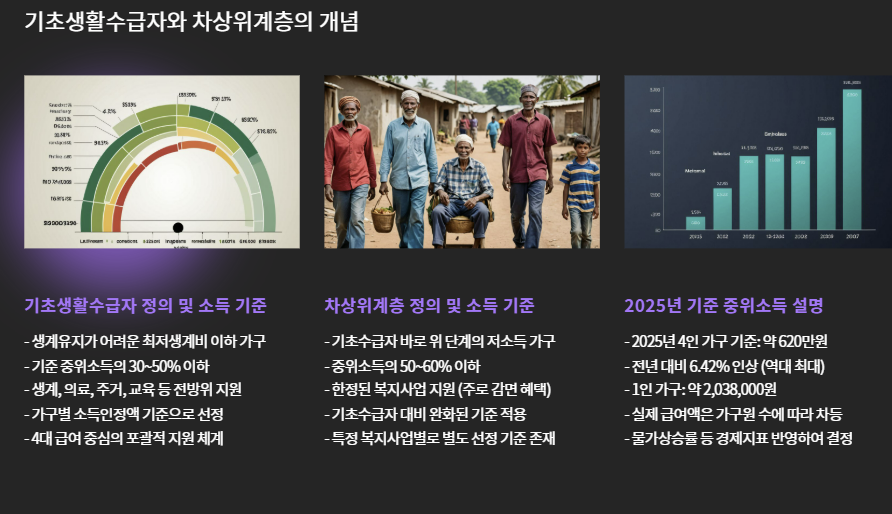 ※ 기준 중위소득은 매년 보건복지부에서 고시하며, 2025년 기준으로 4인가구 약 620만 원 이하 수준입니다.